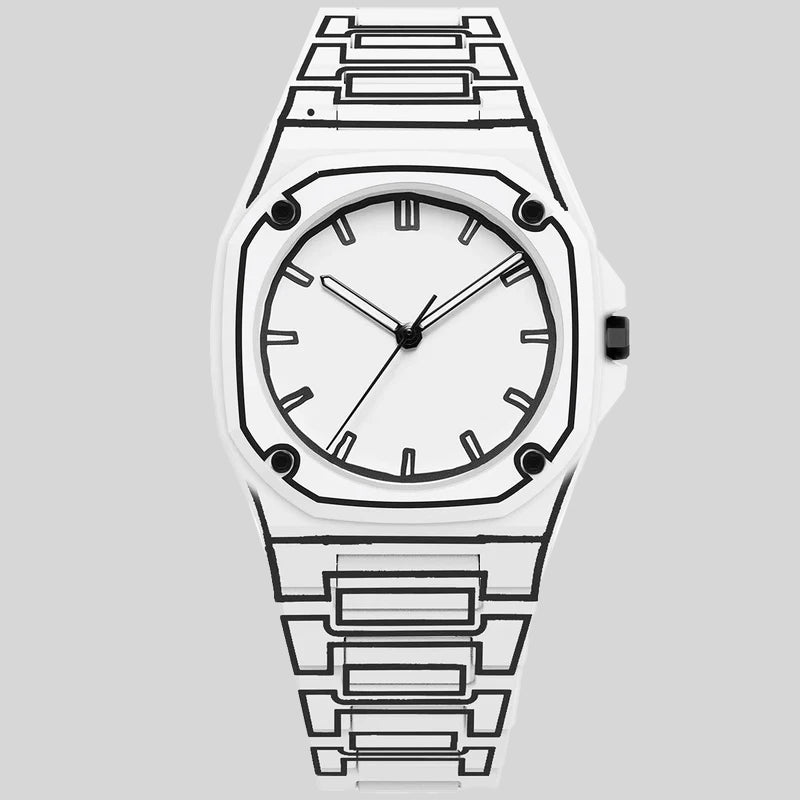 This outline watch brings a bold, graphic approach to a classic timepiece shape. The defined contours and minimal dial create a look that feels minimalistic and modern.